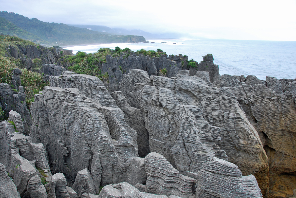 Next, we were heading along to the West Coast…a place that a friend described as rainy, with more rain. We were ready. The coastline has amazing rock formations which were a bit hard to see in the mist and gray, but certainly would be spectacular on a bright day. We did get some spectacular sightings at our stop at Pancake Rocks. Waves crashed against rock formations staked like pancakes and created blow holes with a large spray emerging through the ground. Hector’s Dolphins, a small type of dolphin which can only be found in the waters of New Zealand, jumped and played in the large waves. They put on a show for about an hour and despite the drizzle we didn’t want to leave.