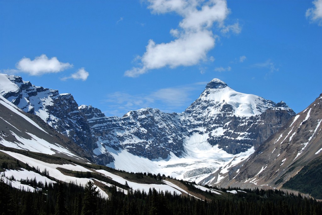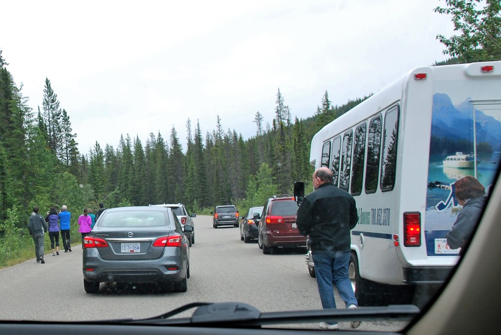 With somewhat better weather, our attention turned to the north – Jasper National Park. We headed up later in the day via the Icefields Parkway, but not before revisiting Lake Louise with clearer skies (still just so-so) and checking out Moraine Lake – absolutely beautiful with remarkable turquoise water. Driving the parkway provided more of the mountain views we’d grown to love in the area. Rocky peaks with hanging glaciers and waterfalls had become the norm. There is no lack of scenery there.